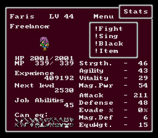 Serity’s wizardry from FF5R finally imported over: now Knight Sword, Ninja Sword, and Boomerang are visible as equips!