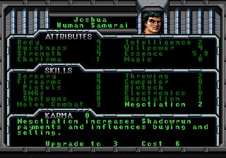 This patch is designed to add an extra benefit to the Negotiation attribute Shadowrun for the Sega Genesis